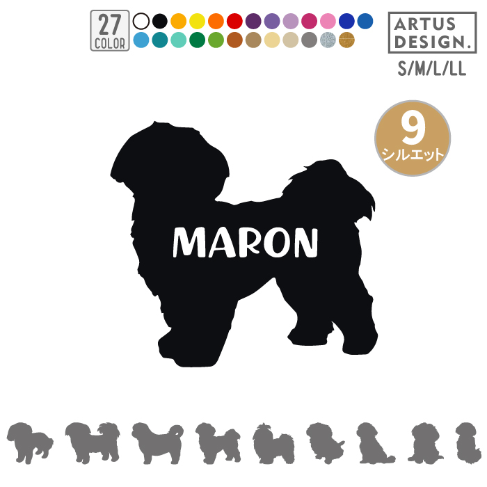 | 選択項目 | 【1】ステッカーの色を27色の中からお選びください。 【2】シルエットをお選びください。 【3】フォントを1〜12(または名前無し)の中からお選びください。 【4】シルエットの向きをお選びください。 【5】ワンちゃんのお名前を8文字以内でご記入下さい。(※アルファベット、ひらがな、カタカナのみ) |