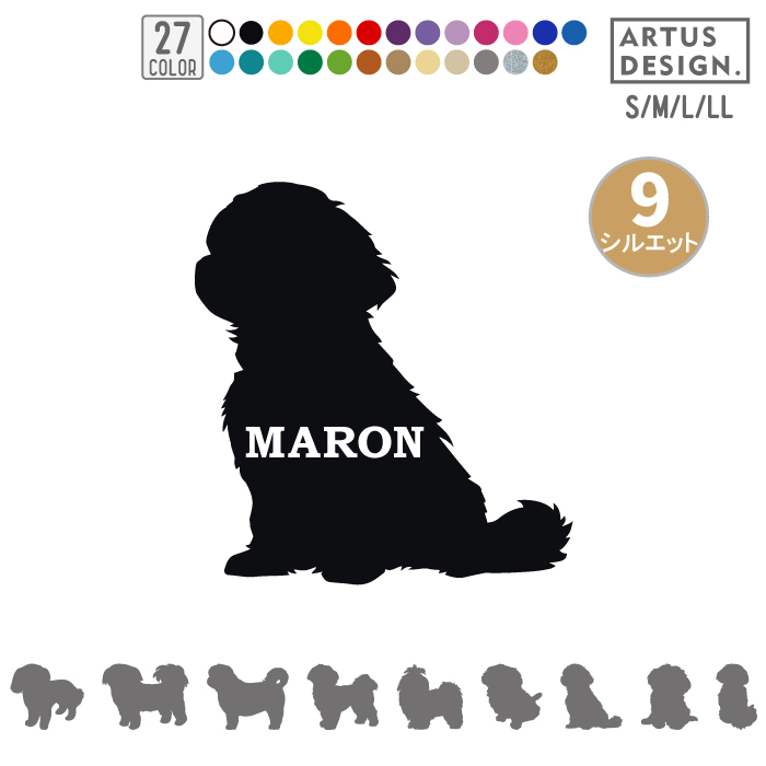 | 選択項目 | 【1】ステッカーの色を27色の中からお選びください。 【2】シルエットをお選びください。 【3】フォントを1〜12(または名前無し)の中からお選びください。 【4】シルエットの向きをお選びください。 【5】ワンちゃんのお名前を8文字以内でご記入下さい。(※アルファベット、ひらがな、カタカナのみ) |