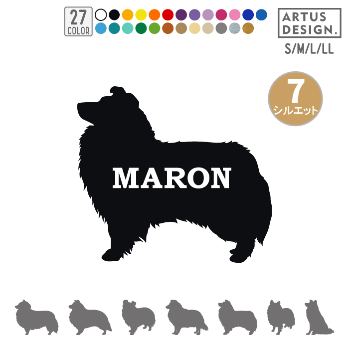 | 選択項目 | 【1】ステッカーの色を27色の中からお選びください。 【2】シルエットをお選びください。 【3】フォントを1〜12(または名前無し)の中からお選びください。 【4】シルエットの向きをお選びください。 【5】ワンちゃんのお名前を8文字以内でご記入下さい。(※アルファベット、ひらがな、カタカナのみ) |