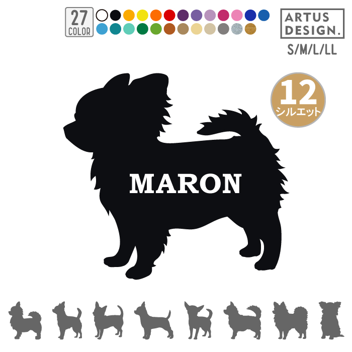 | 選択項目 | 【1】ステッカーの色を27色の中からお選びください。 【2】シルエットをお選びください。 【3】フォントを1〜12(または名前無し)の中からお選びください。 【4】シルエットの向きをお選びください。 【5】ワンちゃんのお名前を8文字以内でご記入下さい。(※アルファベット、ひらがな、カタカナのみ) |