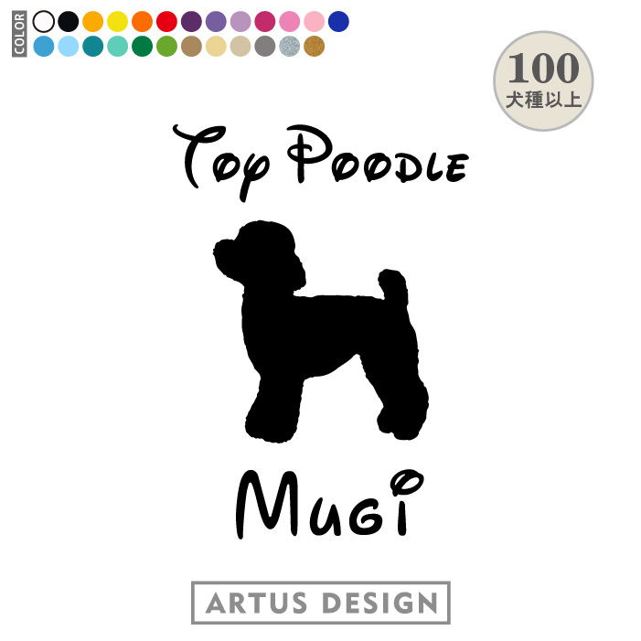 | 選択項目 | 【1】ステッカーの色を21色の中からお選びください。 【2】シルエットを1A~121Cの中からお選びください。 【3】フォントを1〜4の中からお選びください。 【4】シルエットの向きを「右向き」「左向き」からお選びください。 【5】ワンちゃんのお名前をご記入ください。 |