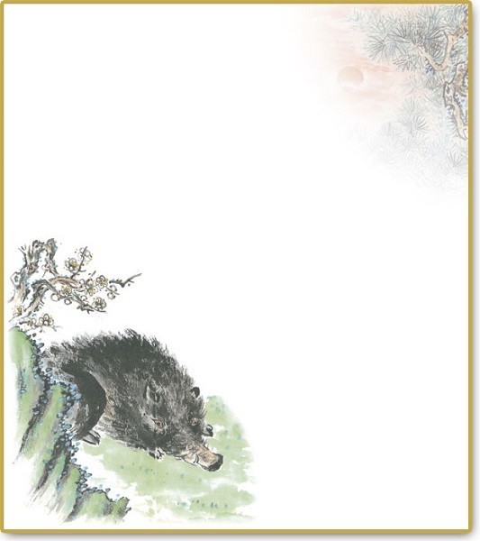 空いてる部分に賛を書き込むタイプの色紙です。2019年度・亥年にふさわしい古語を集めた参考語句の一覧表付で、どなたでも簡単に画賛色紙が出来ます。