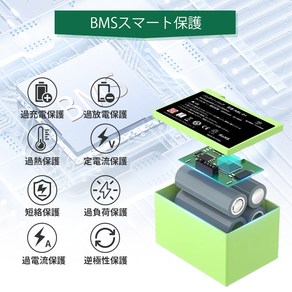 ★短絡保護、過熱保護、過放電保護、回復保護、過電流保護、過充電保護、過電圧保護、電源保護の8重の保護が内蔵しています。