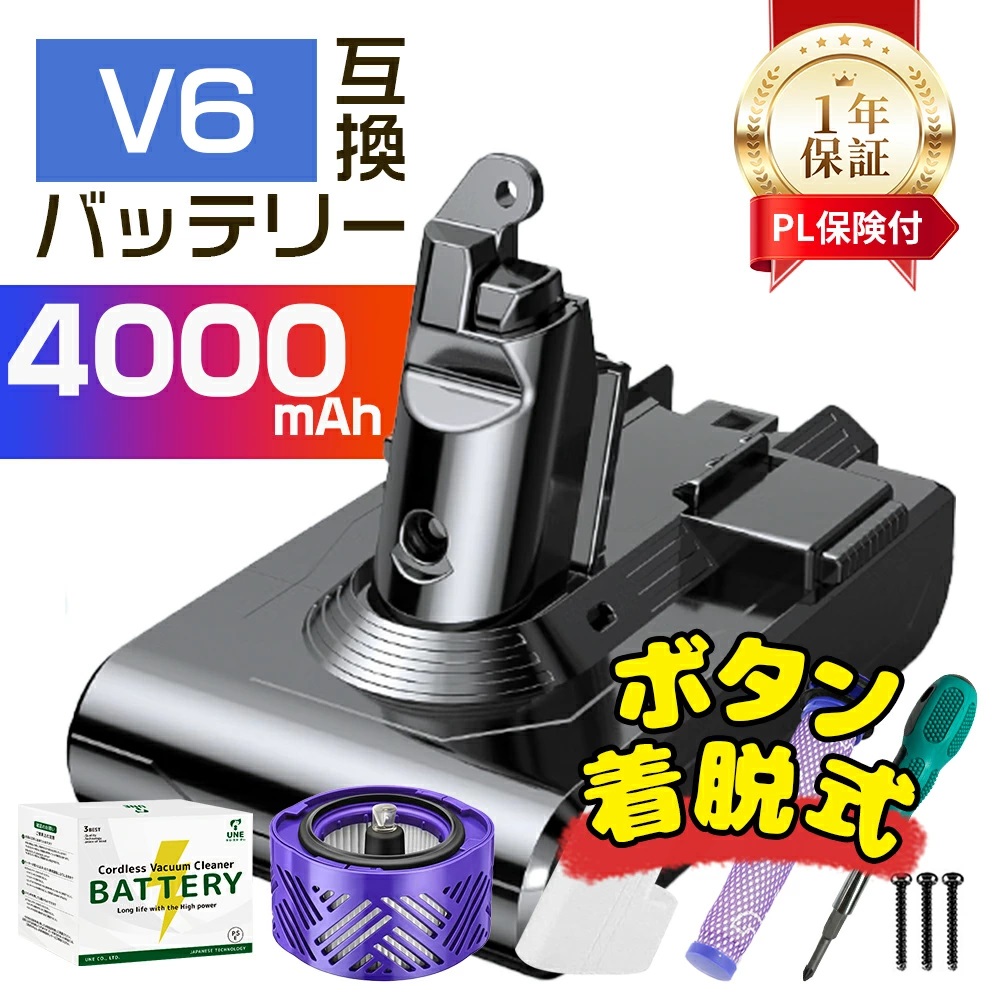 【10倍ポイント還元】ダイソン V6 バッテリー ボタン式 ネジ不要 3秒組立 4000mAh 充電バッテリー 交換用バッテリー 互換バッテリー 純正品 より超長持ち