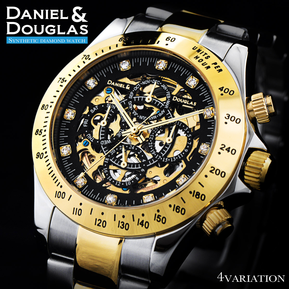機械式 自動巻き 腕時計 メンズ 時計 ダニエルアンドダグラス オートマチック ブランド ゴールド ブラック ダイヤモンド