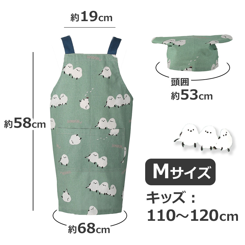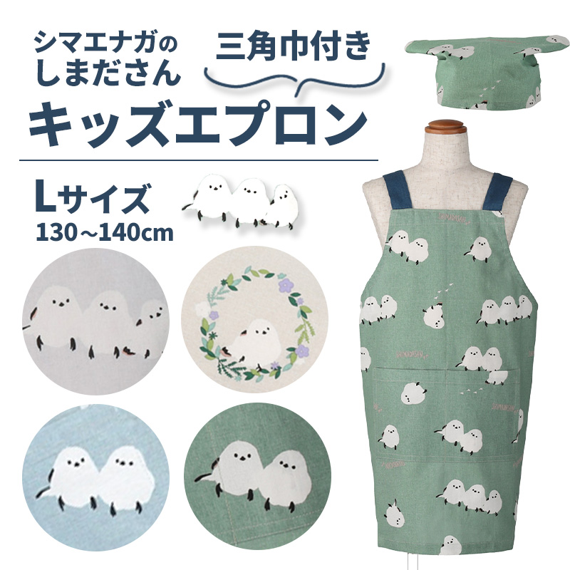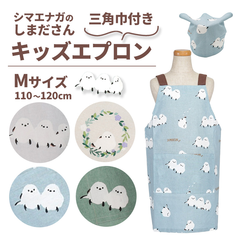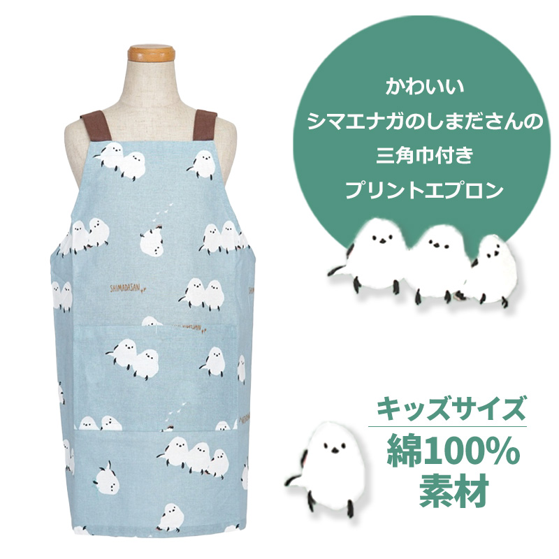 かわいいシマエナガのしまださんがいっぱい♪三角巾とセットのキッズエプロン。身長110〜120cmのお子様サイズです。