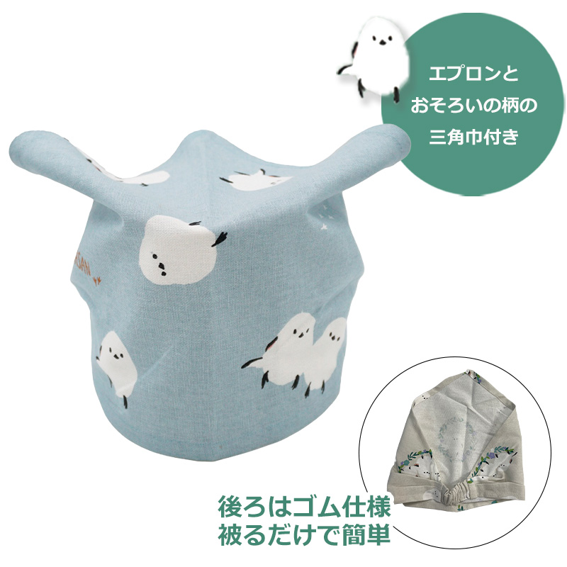 エプロンとおそろいの柄の三角巾付き。後ろがゴムになっておりスポッと被るだけで簡単♪