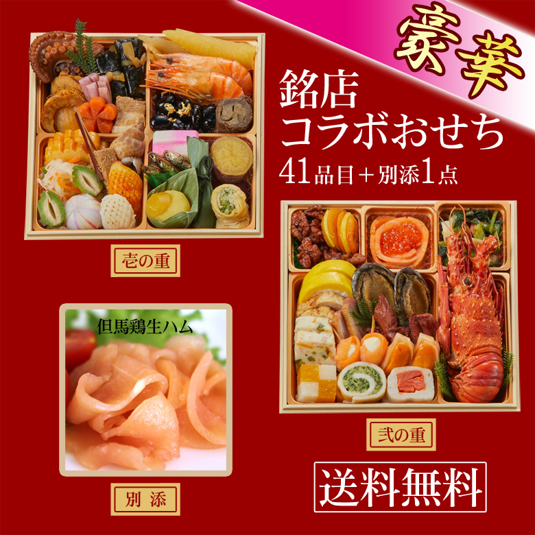 \クーポン有/ おせち 豪華 銘店コラボ 3〜4人前 2段重 41品+鶏生ハム300g 送料無料