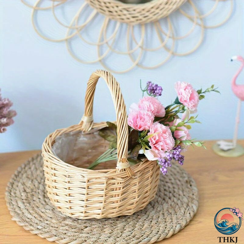 手作りの籐編みバスケット、花バスケット、屋外ピクニックバスケット、食品保存用ポータブルバスケット、レトロで多目的な丈夫な雑貨収納バスケット、家庭用収納