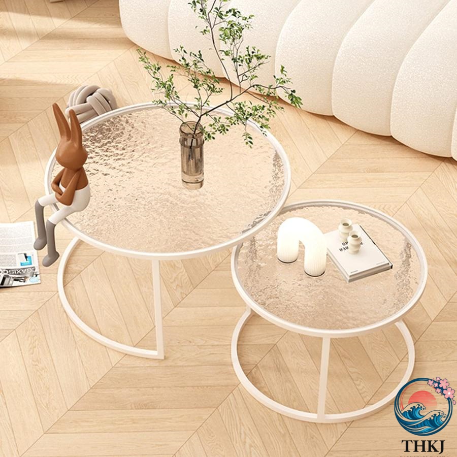 ??【ガラス製ネスティングテーブル】これは、リビングルームに省スペースでモダンなソリューションを提供する、2つの丸いネスティングテーブルを備えたユニークなコーヒーテーブルです。 さまざまなスタイルのガラストップとサイズから選択できます
