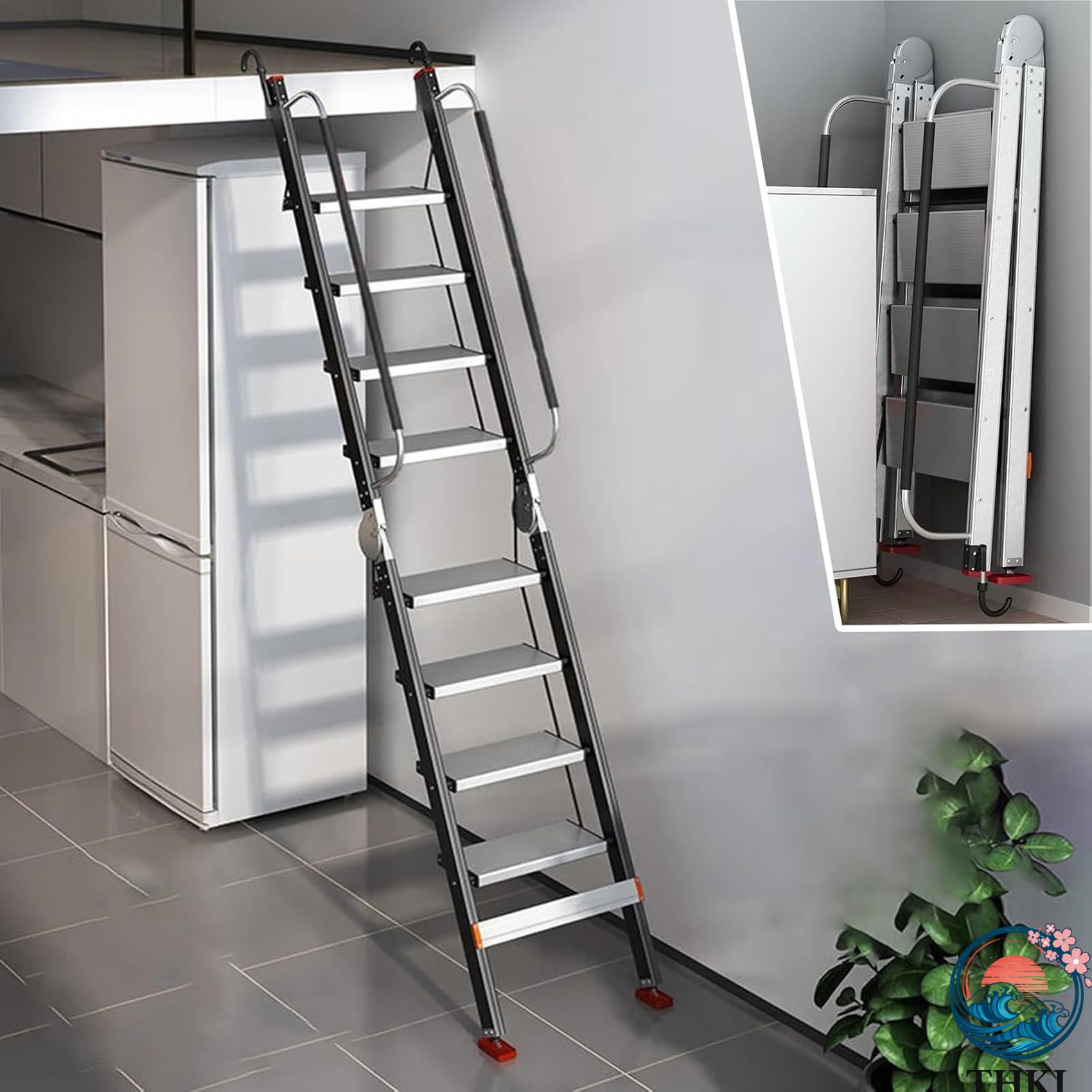 【折りたたみ式デザイン】折りたたみ式のデザインにより、ロフトはしごの保管や持ち運びが簡単になります。使用しないときは、場所を取らずに小さく折りたたんで保管できます。