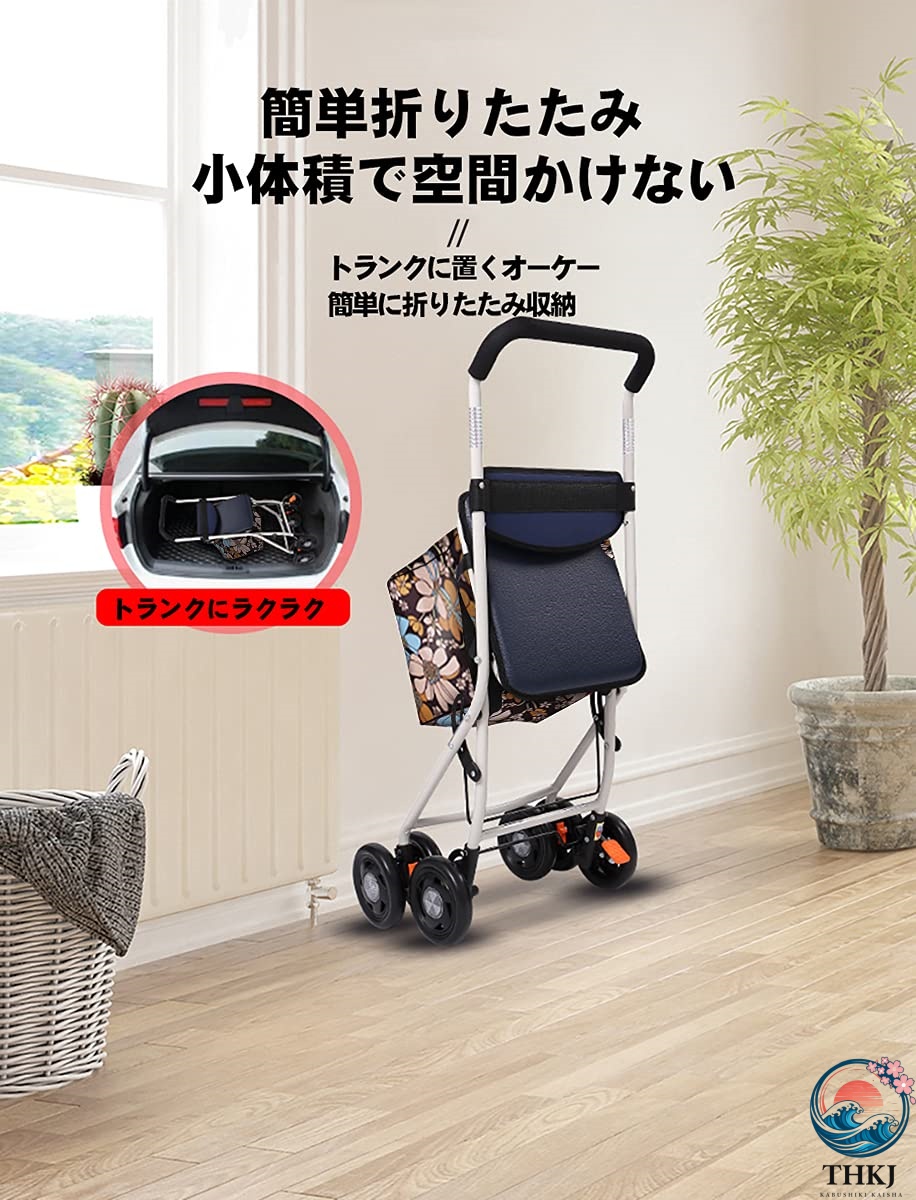 折りたたみ-使用者体重が100kgまで座れる手押し車が保管の際には一つのボタンと一つの引っ張りですぐに折りたためます。公共交通(バス、電車、新幹線、等々)を利用される方には空間を取らないように狭い場所にも保管できます。例えば車のトランク、電車内
