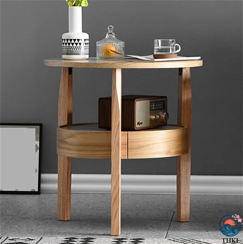丸型コーヒーテーブル、ラウンドオークウッドコーヒーテーブル 隠し引き出し付き 2段 小さなソリッドウッドサークルコーヒーテーブル 素朴なラウンドサイドテー