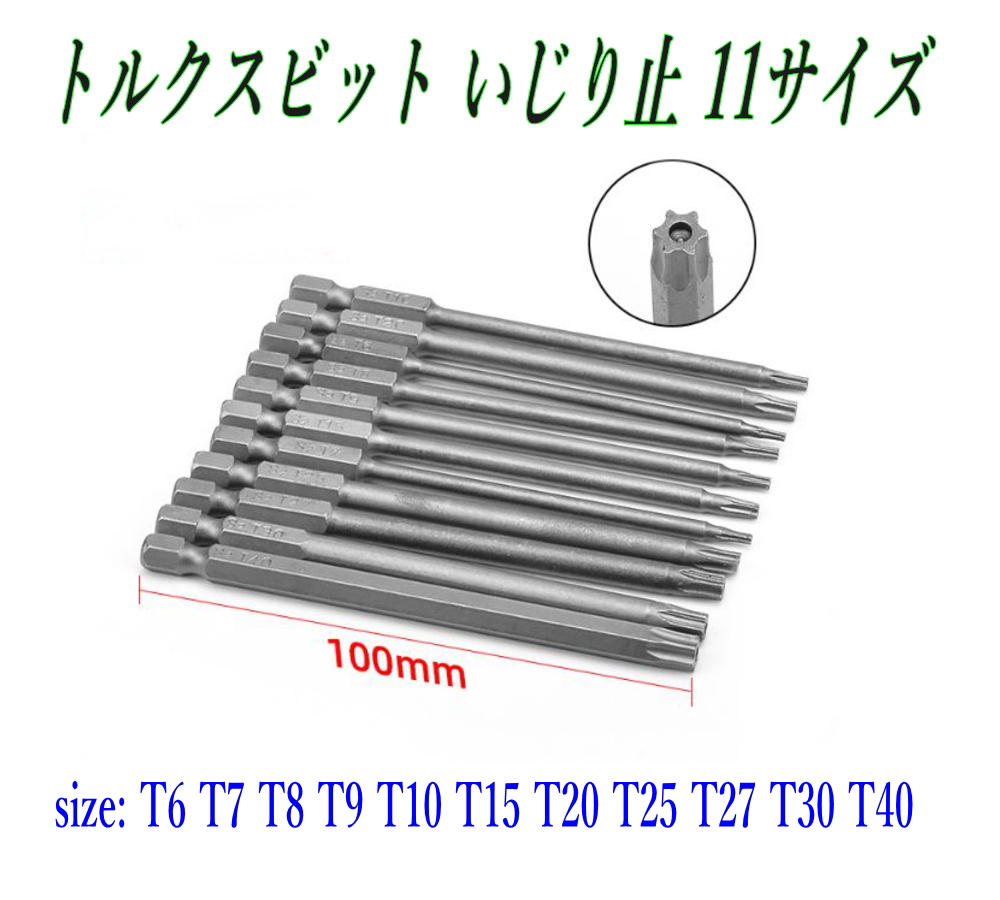 トルクスビット いじり止め トルクスビットセット セキュリティトルクス セキュリティビット TORXビット いじり防止ビット T5 T6 T7 T8 T9 T10 T15 T20 T25 T27 T30 T40 12本セット 11PCS 100mm 6.35mm 六角シャンク 電動ドリル インパクトドライバー ビットセット ネジ外し 自動車整備 バイク整備 自転車整備 家具組立 家電分解 DIY工具 S2鋼 マグネット付