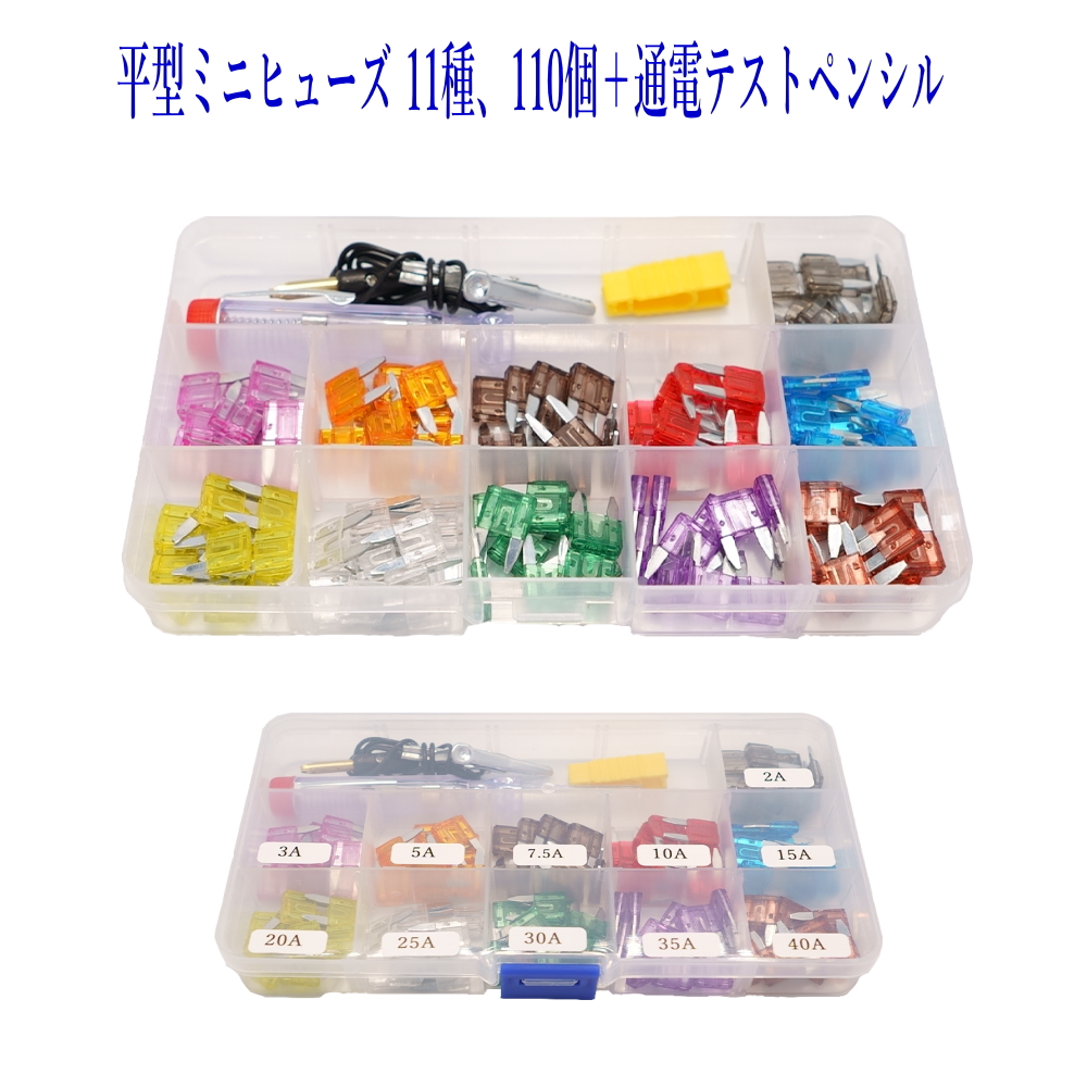 平型ミニヒューズ 11種、110個+通電テストペンシル セット BOX入り H1011-34