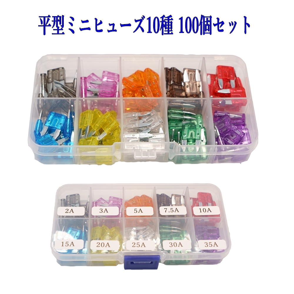 平型ミニヒューズ 10種、100個セット BOX入り ブレードヒューズ H1015