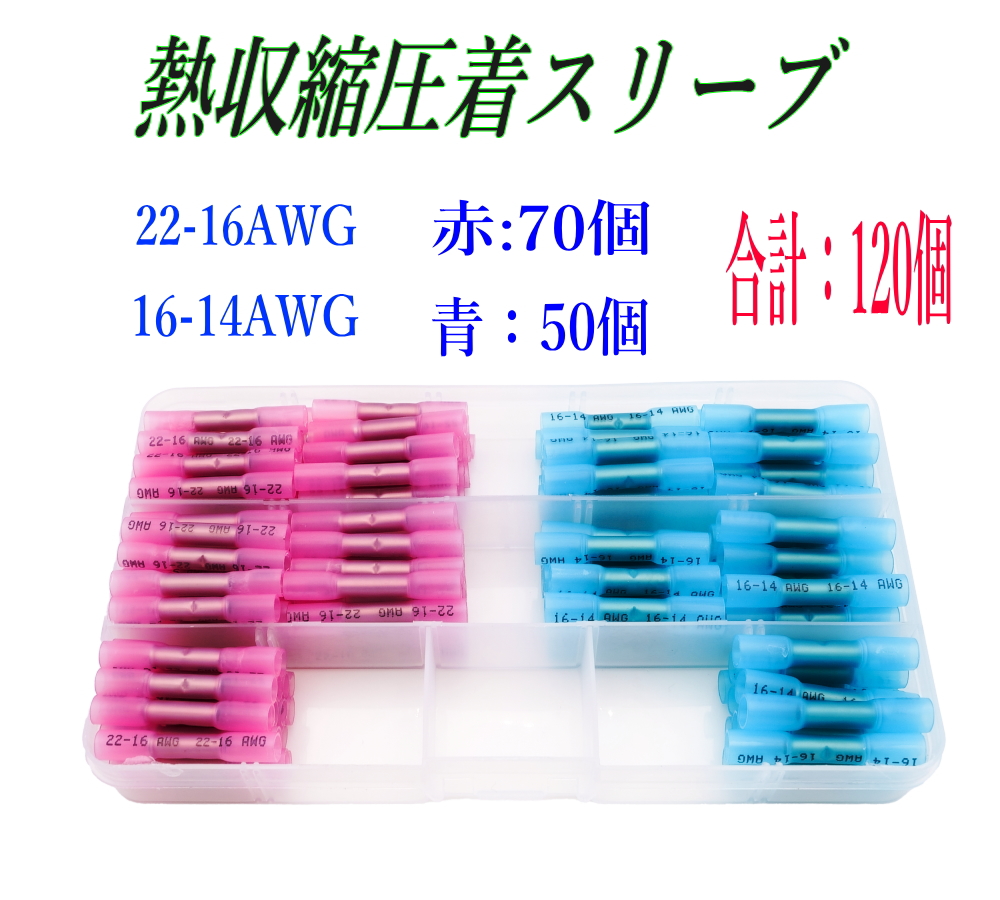 熱収縮圧着スリーブ 赤70個 青50個 計:120個 防水圧着端子 配線接続 絶縁端子 ケース入り