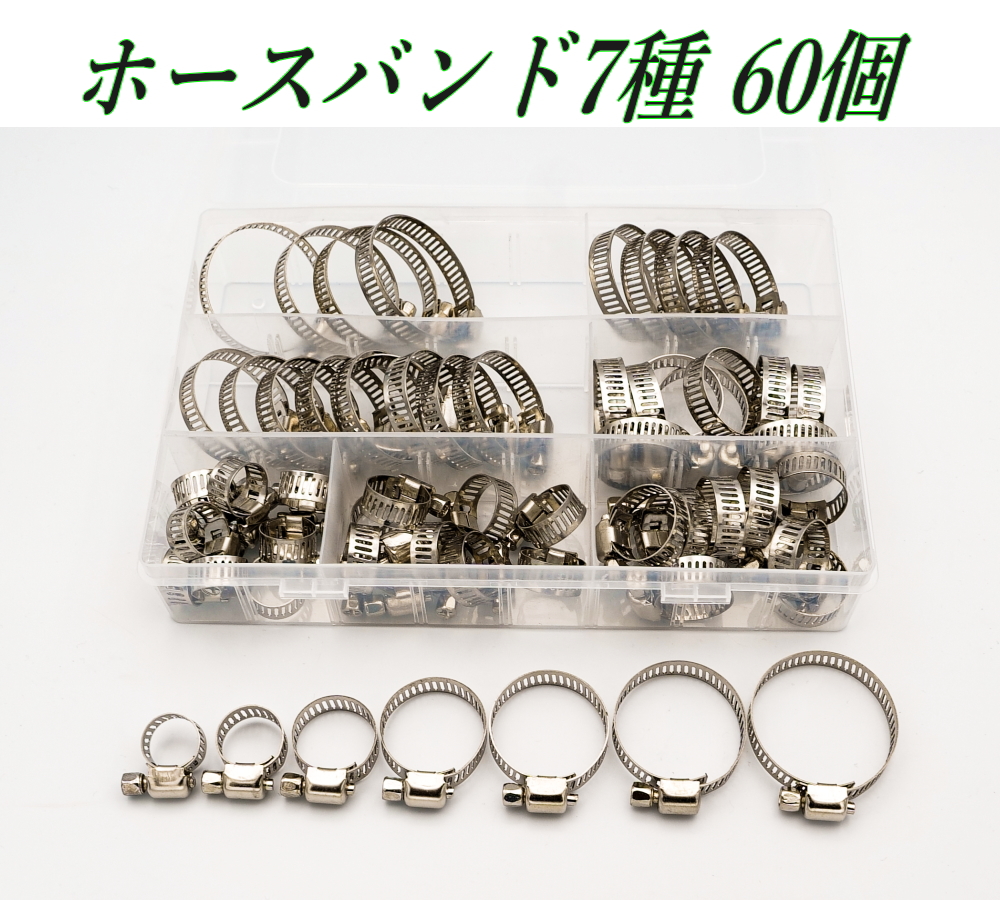 ホースバンド ステンレス ホースクランプ クランプバンド 7サイズ 60個 8〜38mm 8-12mm 10-16mm 13-19mm 16-25mm 19-29mm 22-32mm 25-38mm 配管 修理 自動車 バイク 燃料ホース エアホース 水道 園芸 農業 クーラント 漏れ防止 締め付け ネジ式 まとめ買い アソート セット DIY 工具