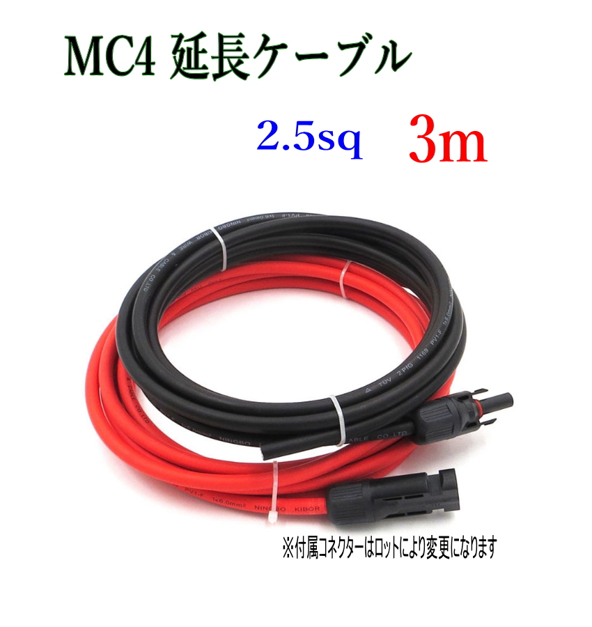 ソーラーケーブル延長ケーブル MC4 片側コネクタ付き 3m 2.5sq 赤と黒2本セット