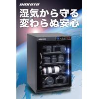 この道15年の有名メーカーで生産しております。 多くのプロカメラマンが愛用されてるモデルです。 ランニングコストが安い:1日2円のランニングコスト、2か月で缶コーヒー1本分です。商品名: HOKUTO防湿庫・ドライボックス88L LED照明内蔵5年保証 容量 :88L 電源 :100V(50/60Hz) 外寸 :W380mm×D390mm×H604mm 内寸 :W376mm×D360mm×H555mm(突起部除く) 設定湿度範囲: 25%〜80%RH 材質 キャビネット本体: スチール製メラミン焼付塗装 扉: マグネット式/正面強化ガラス 付属品: ・ACアダプター ・スポンジマット(波タイプ1枚、平タイプ2枚) ・スライド式棚3枚・デジタル湿度/温度計(電池不要) ・日本語説明書 注意事項:防湿庫発送時の破損リスクを最低限にするため、工場出荷時取っ手は内側に取り付けております、ご使用前に表側に取り付けてご使用ください。※ 除湿機能のみ加湿機能ありません。HOKUTO HPシリーズに搭載されたペルチェ式電子全自動ドライユニットは「オートドライ超省エネ・エコ設計」内蔵LED照明を加える事で暗いところでも使いやすい。アジャスターを装備しており不整地でも設置可能。ロックキー付き小さいお子さんの悪戯にも安心。強化ガラスを使用する事で割れにくい、割ったとしても怪我しにくい。消費電力:HOKUTO HPシリーズに搭載された全自動ペルチェ式電子ドライユニットは「超省エネ・エコ設計」1日約1.2円が目安です。(※1kWh=22円 自動制御運転時間を10時間で算出、稼働環境によって少し変動します)極めて湿度が高い環境に設置されでも24時間除湿運転した場合でも1日約2.5円の超省エネ設計です。操作&設置が簡単、管理が楽になります:HOKUTOの防湿庫はコンセントに通電するだけで面倒な乾燥剤の交換不要です、管理がとても楽になります。気密性の高いキャビネットが日常生活で発生するホコリを軽減し、機械が常に安定した湿度環境を保ちます。ほんの少し排熱がありますので、背面及び側面部に、3cm以上の隙間を開けて設置ください。(100V 50/60Hz・日本国内屋内仕様 国内規格の電気安全法(通称PSE)取得しております)アフターサービス:当店安心な5年保証 。世界20カ国発売の実績、信頼の品質、万が一故障の場合は当店で無償修理いたします。(電気回路部分のみ、機械部分は対象外)