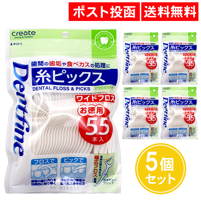 糸ピックス ワイドフロス 55本入 5個セット デントファイン フロス 糸ピック 歯間 お徳用 送料無料 クリエイト
