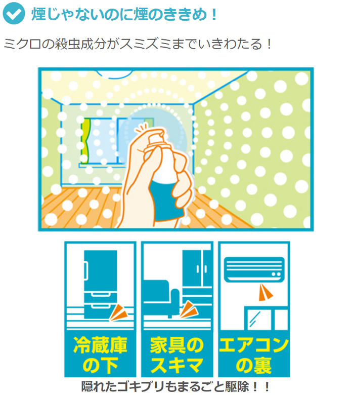| 用途 | ゴキブリ、ハエ成虫、蚊成虫、トコジラミ(ナンキンムシ)の駆除 |