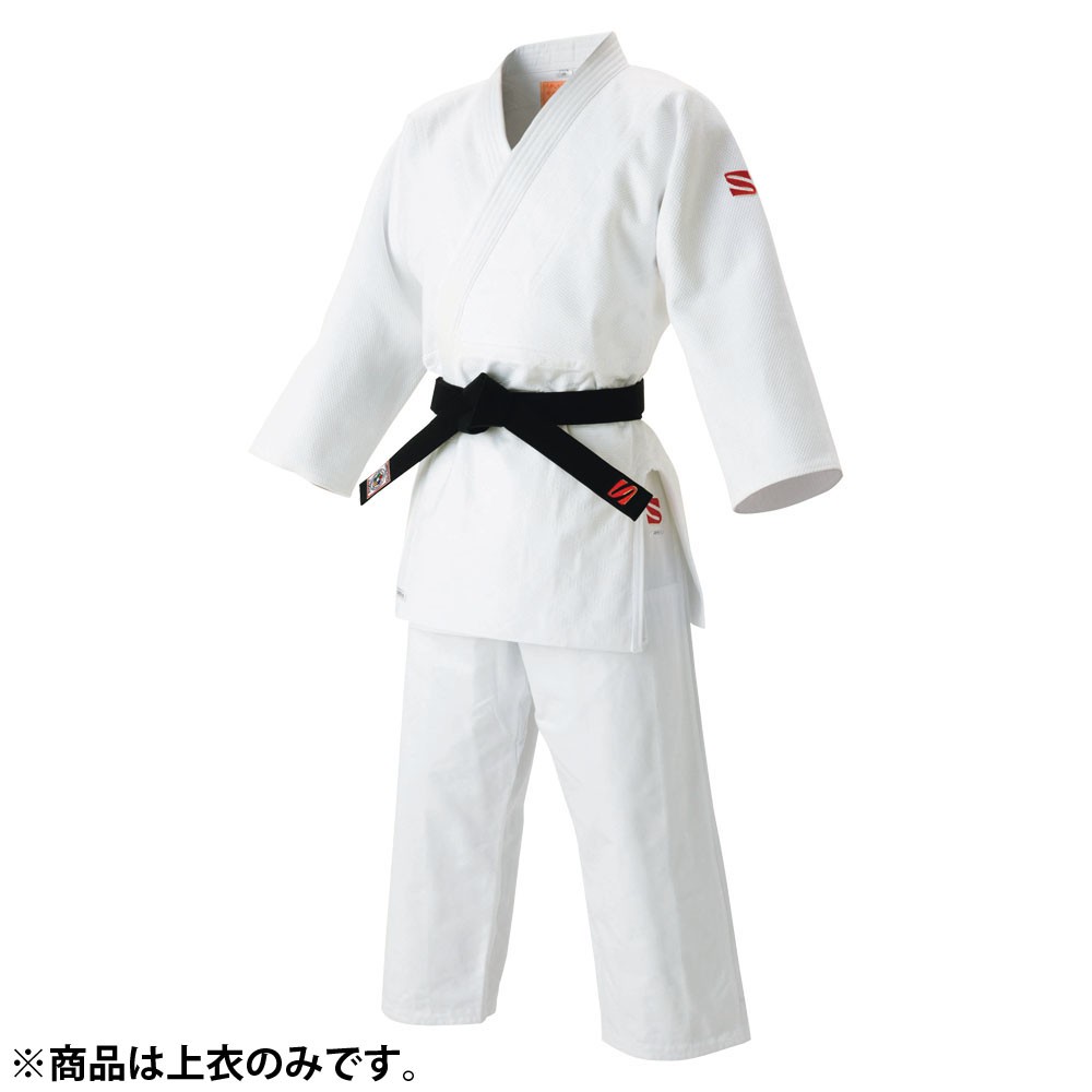 全柔連新規格基準、IJF公認モデル。国内及び国際大会選手用。全柔連主催大会における柔道衣(及び帯)ガイダンスの全ての項目を満たしております。上衣のみの販売になります。二重織刺子生地引張り強度は縦横共2700N以上。サンフォライズ加工済柔道衣です。師範、実業団・大学・高校選手向け。帯は別売りになります。