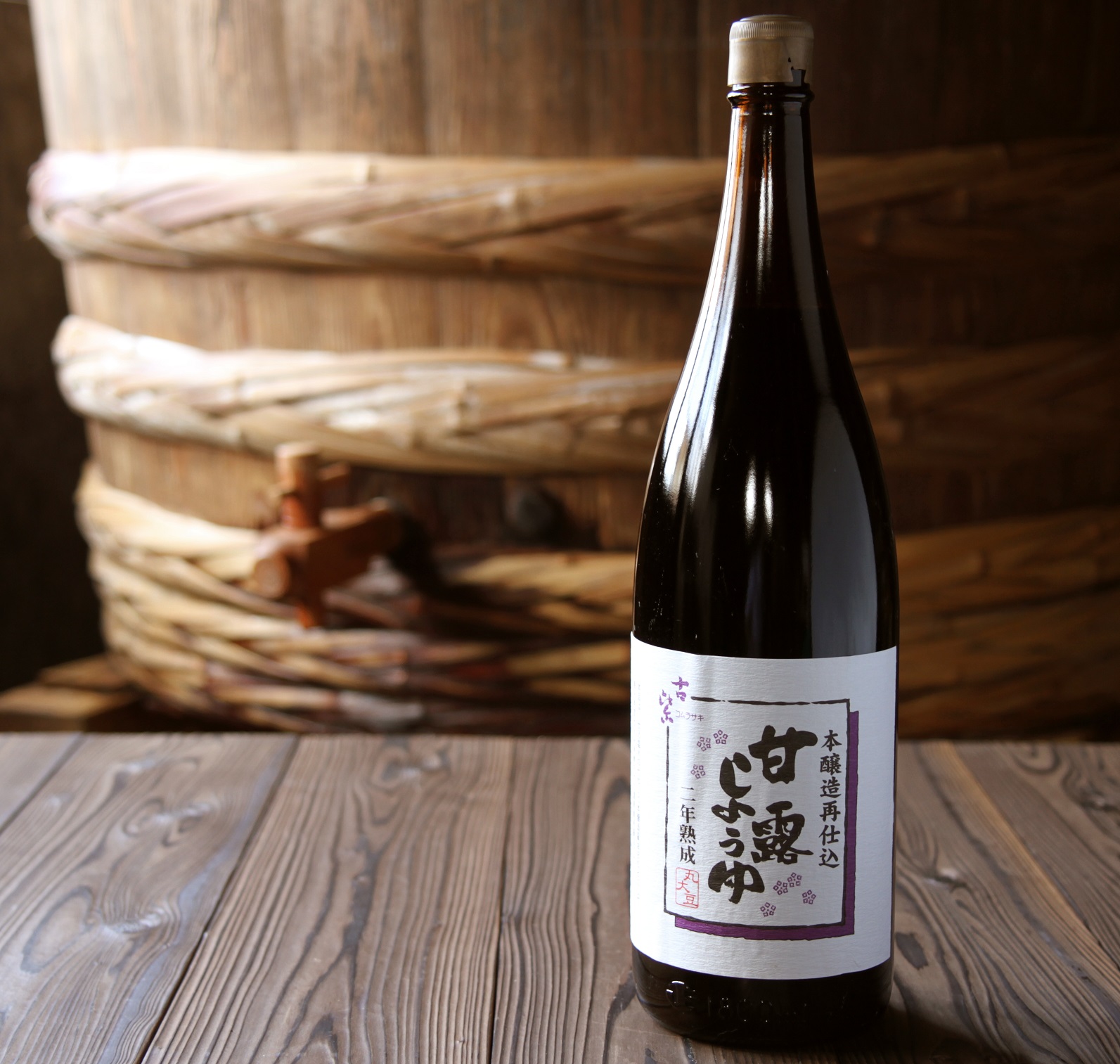この『こむらさきしょうゆ』は厳選された材料を蔵内地下水で仕込み、杉桶で長期熟成させました。