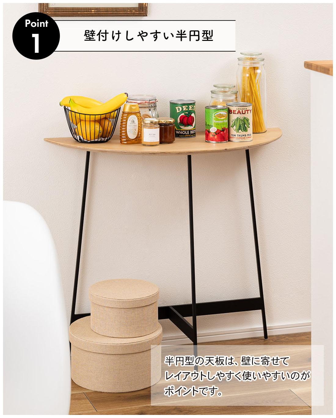 ●半円型の天板は壁に寄せてレイアウトしやすく使いやすいのがポイント。