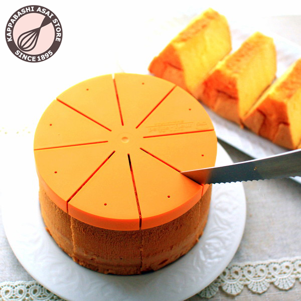 シフォンケーキをそのままカットすると、穴の空洞部分にカット済みのケーキが傾いたりして、ケーキ全体が歪みがちですが、 ケーキアシスタントを使用するとしっかり安定するのできれいにカットできます。 |