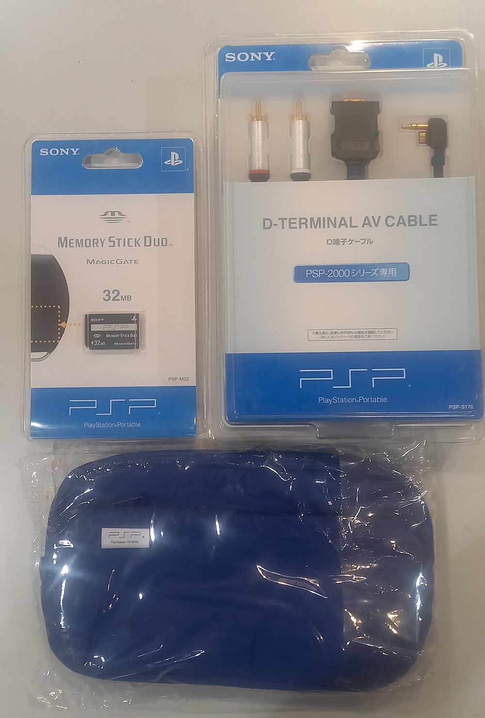 ソニー純正品の『PSP200 D端子ケーブル PSP-S170』『PSP メモリースティック32MB PSP-M32』 『PSP専用ケース』の3点セットになります。