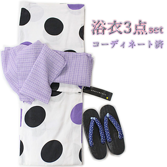 アウトレット 浴衣 レディース セット 黒 水玉 浴衣 帯 下駄 ブランド 婦人 女性用 コーデ済 MERCURYDUO ゆかた 3点セット