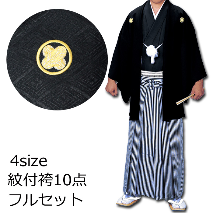 黒 紋付 袴 10点 着物 セット 成人式 紋付き袴 メンズ 男性用 紳士 アンサンブル 紋服 洗える 男 きもの はかま フルセット 激安 お取寄せ商品