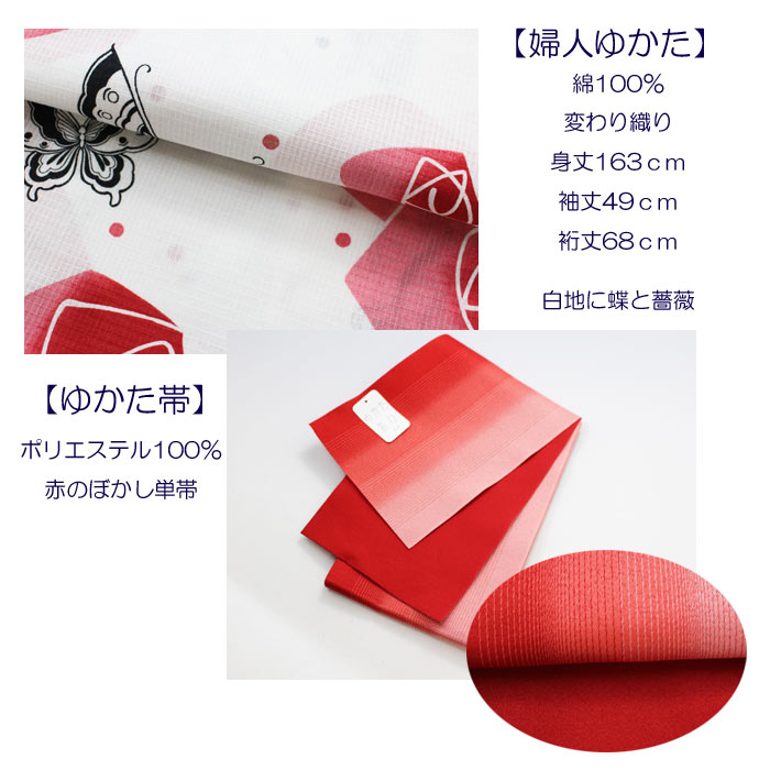 婦人 ゆかた セット 白地 赤 薔薇 蝶 浴衣 ゆかた帯 下駄 巾着 4点 セット ZR