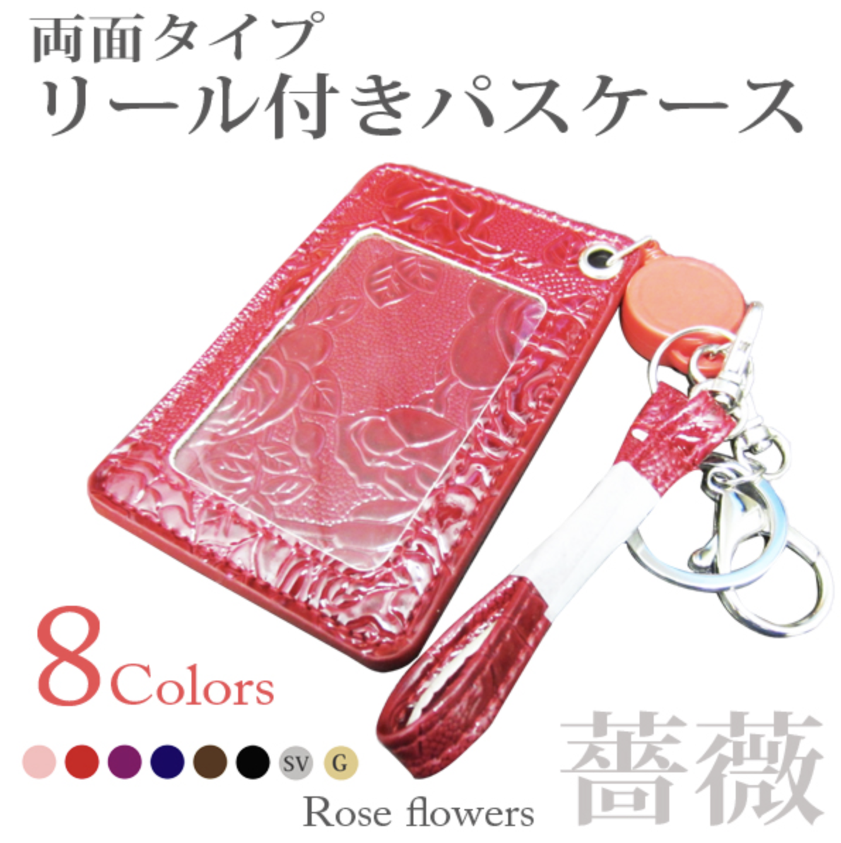 リール付きパスケース レディース 伸びる 定期入れ 薔薇 エナメル ICカード