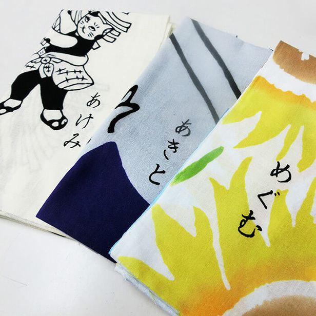 名入れ手ぬぐいを1枚から承ります。結婚式、内祝い、日本土産、記念品に、既製の手ぬぐいに名前を入れてプレゼント!当店で既にご用意している行書体の型を組み合わせて名入れします。版代が発生しないため、個人ネームなど個別の名入れをご希望の方におすすめです。