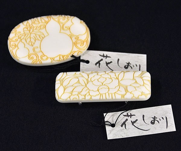 楕円には大小異なるひょうたん・葉が描かれ、長方形には椿の花が描かれた、モダンでお洒落な帯留め。