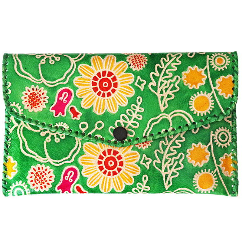 山羊革 財布パース ミモザと花柄(グリーン)(メール便対応)