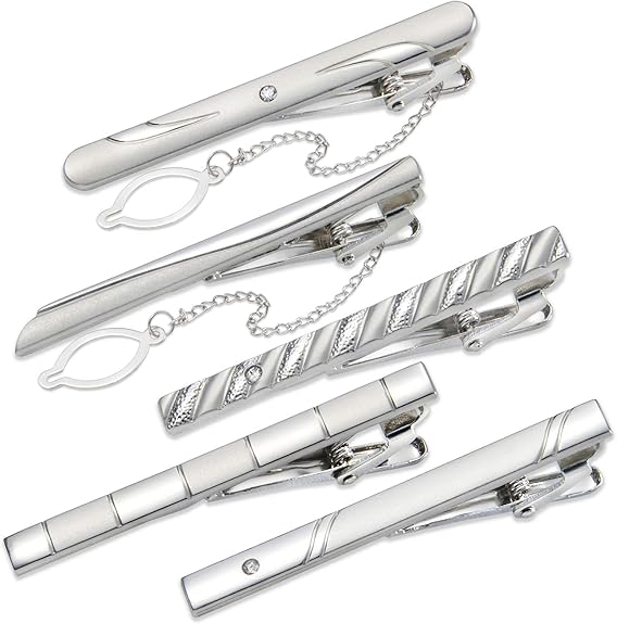 【男性用の紳士小物】お洒落なタイピン5個セットです。付け方はネクタイに挟むだけ。スーツスタイルに個性を出すことができます。カフスボタン、ポケットチーフ、カラーピンなどと組み合わせると、より華やかさを演出できます。