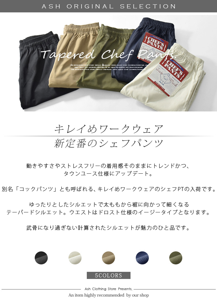 別名「コックパンツ」とも呼ばれる、キレイめワークウェアのシェフパンツの入荷です。