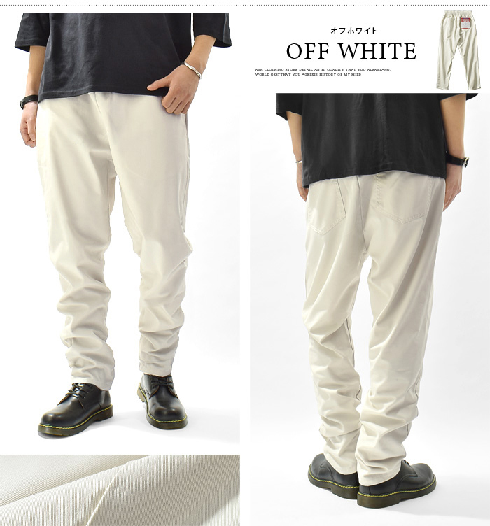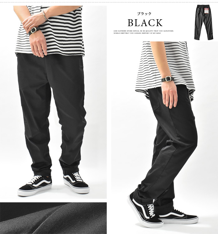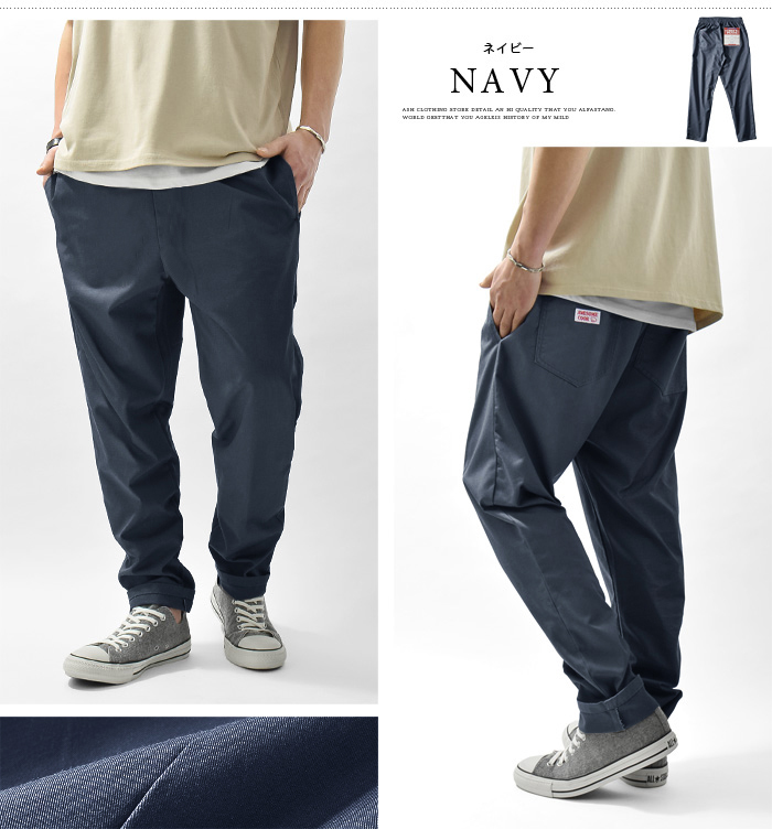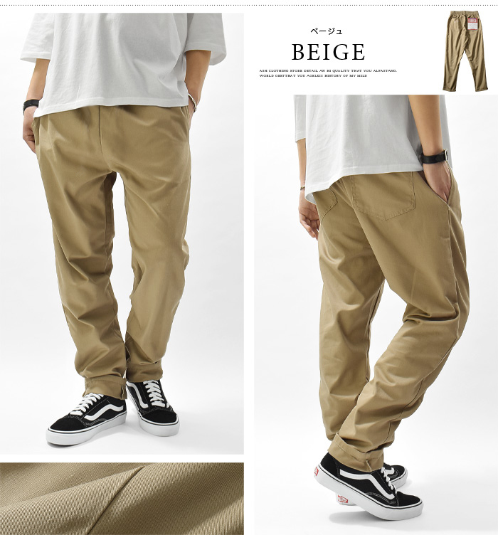 ゆったりとしたシルエットで太ももから裾に向かって細くなるテーパードシルエット。ウエストはドロスト仕様のイージータイプとなります。