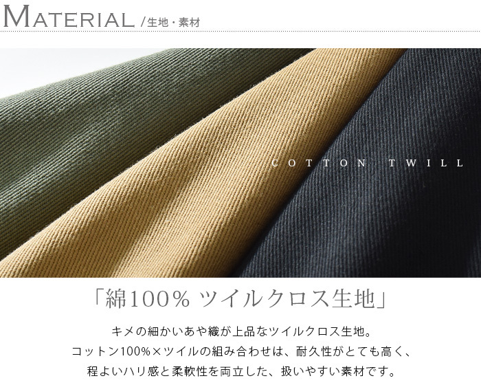 さらっとした肌触りの生地は通気性も良く汚れやシワにもなり難い特性を持ち合わせているコットンツイル。