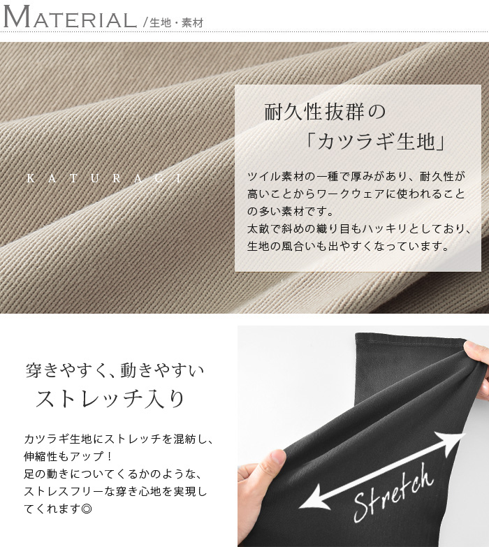 ポリウレタンを混紡したストレッチ入りのカツラギ素材で、穿き心地もとても良く仕上がっています。