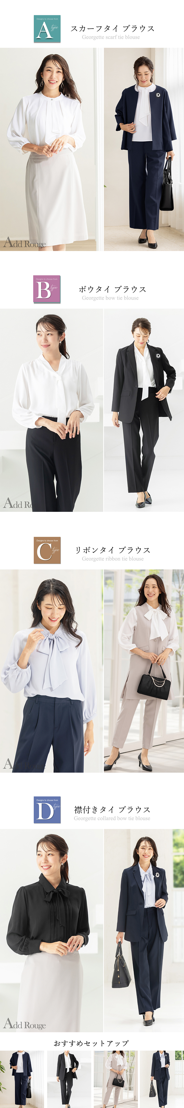 「スカーフタイ」「ボウタイ」「リボンタイ」「襟付タイ」の4種類から選べ、いずれもオフィスからセレモニーまで幅広く活躍する華やかなデザイン