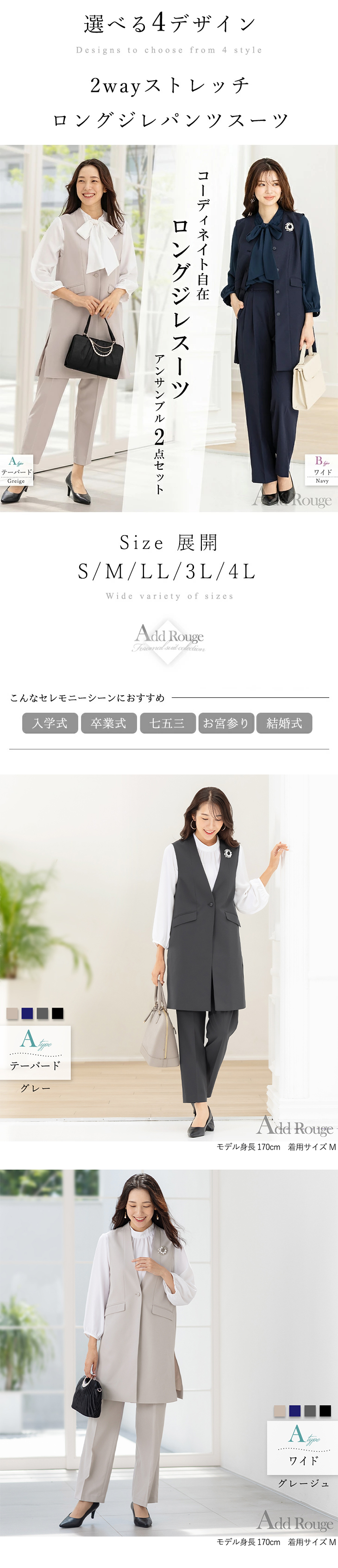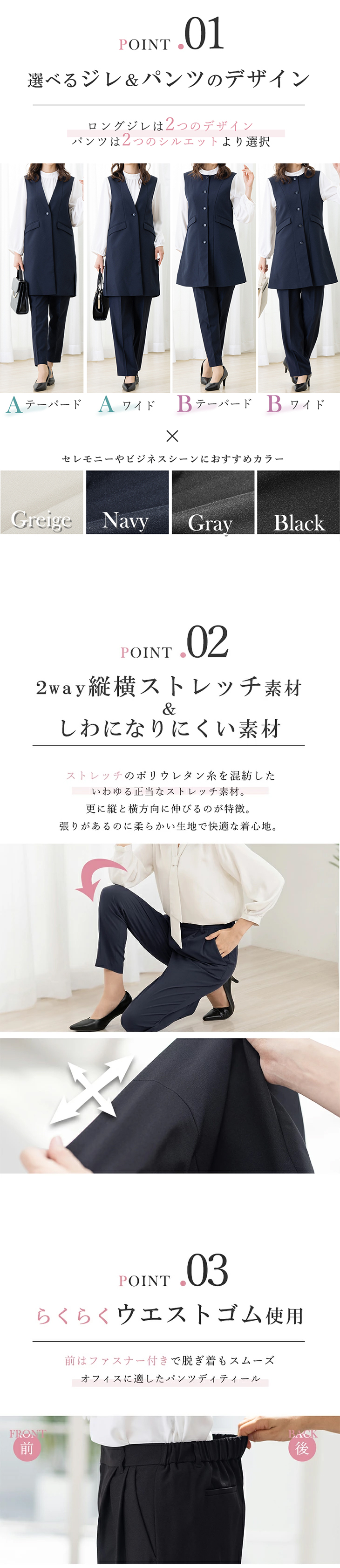 2つのデザインから選べるロング丈のジレと、2つのシルエットから選べるパンツのセットです。