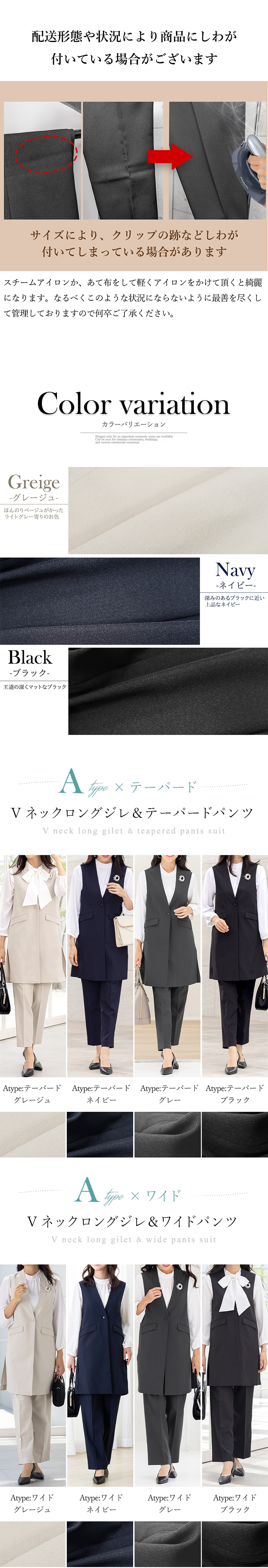 パンツはセンターにタックが入っており、ヒップとお腹周りをすっきり見せてくれるテーパードパンツタイプと、太もも周りをきれいにカバーするワイドパンツもお選びいただけます。