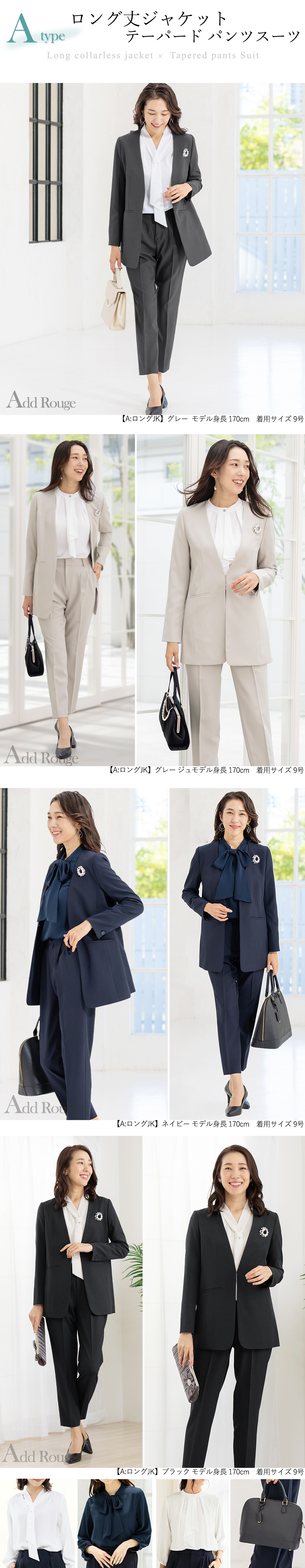 パンツは美脚が叶うテーパードと、王道シルエットのストレート、エレガントに体型カバーできるワイドから選べる、3デザインをご用意。ウエストの後ろがゴム入りなので、長時間ストレスなく着用いただけます。