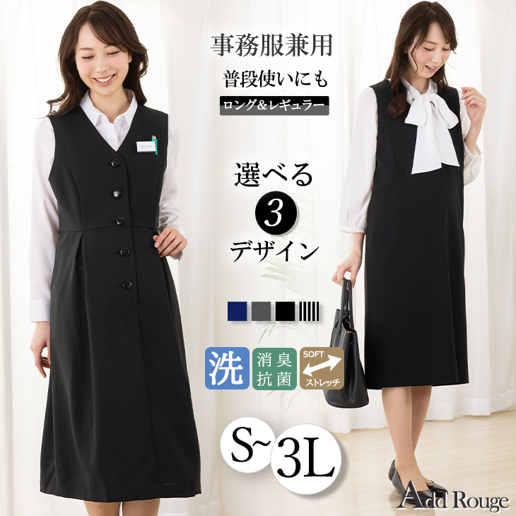 ベストとスカートが一体化した「ベストワンピース」は、産前産後長く使えるようマタニティ対応にしたママにうれしい事務服です。