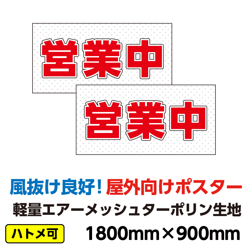 エアーメッシュ ターポリン 屋外ポスター2枚セット 養生幕 横断幕 足場幕 シート看板 「営業中」1800mm×900mm 横 現場 防水 破れない