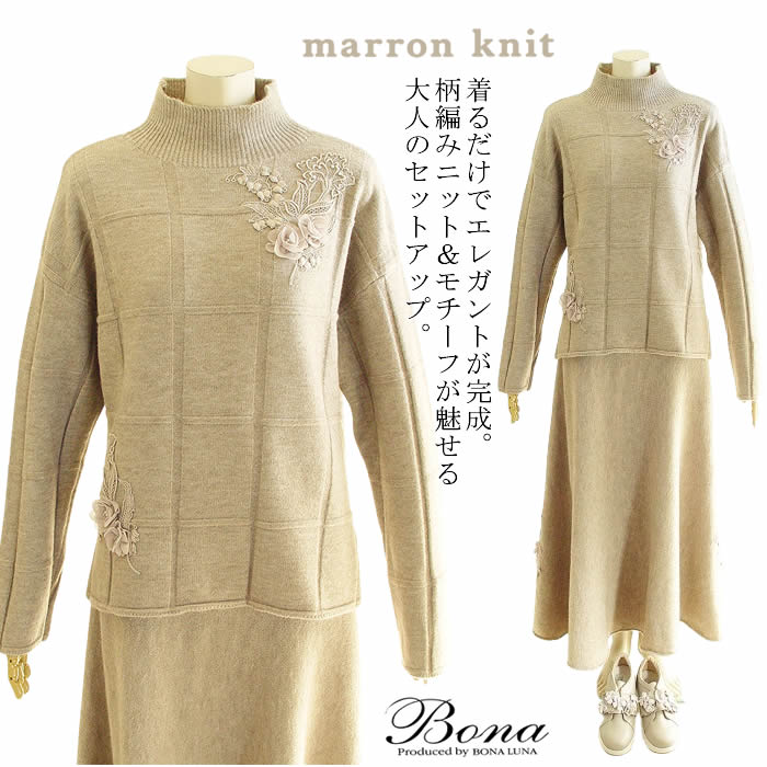 ボナ Bona すずらんレースニットアンサンブル 洗える 日本製 レディース 長袖セーター スカート ニット セットアップ ベージュ おしゃれ セーター 春 秋 冬